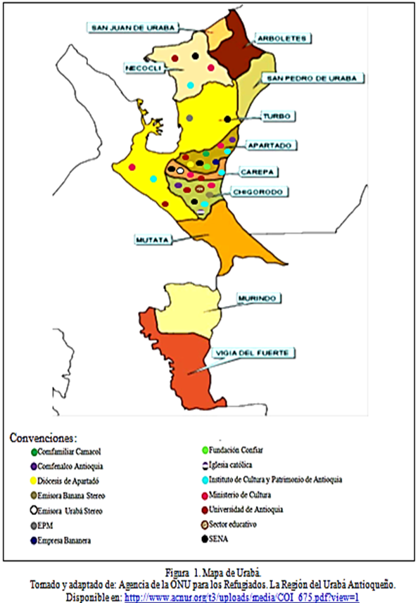 A continuacion se muestra el mapa de Urabá donde se identifican los actores que actualmente apoyan la ICC y el emprendimiento cultural en la región: